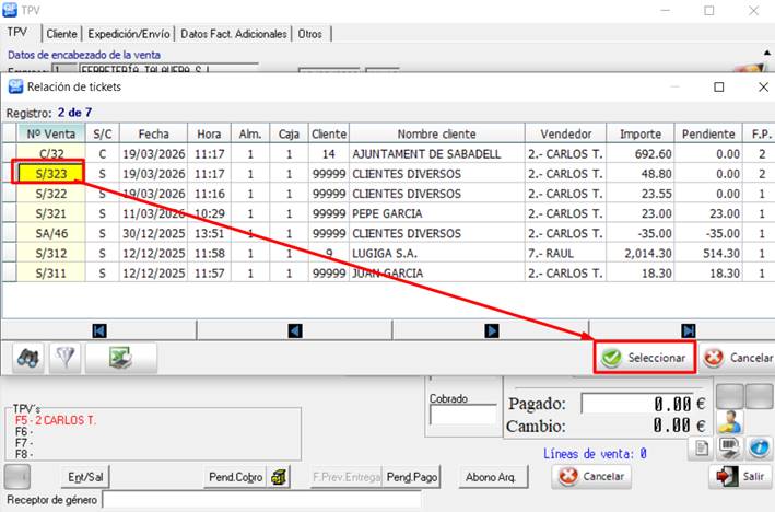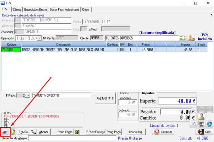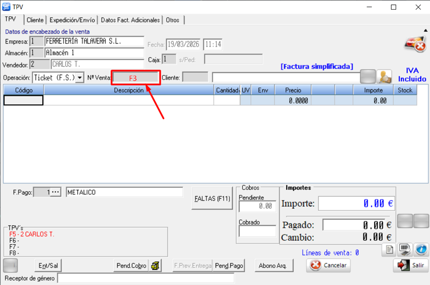 En este caso, como el ticket todavía no está arqueado (seguramente porque es del mismo día), podremos recuperar el ticket desde la pantalla de TPV, yendo a la casilla de “Nº Venta” y pulsando el botón F3: